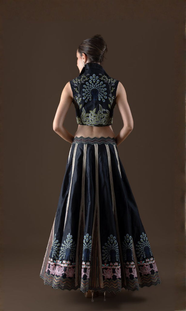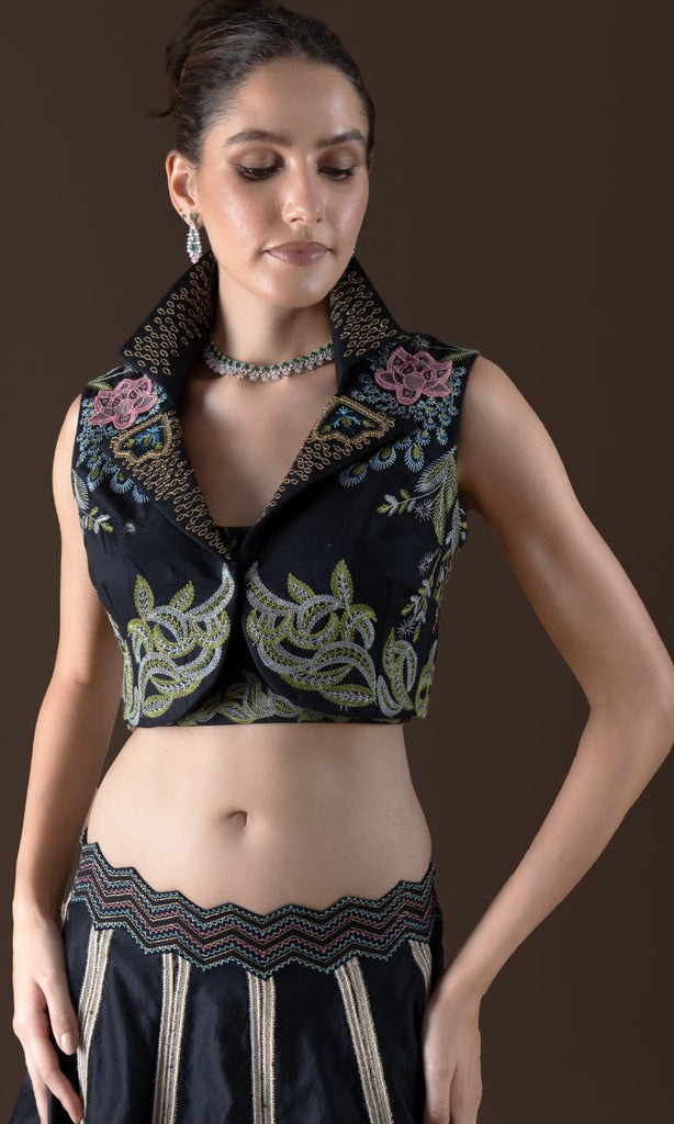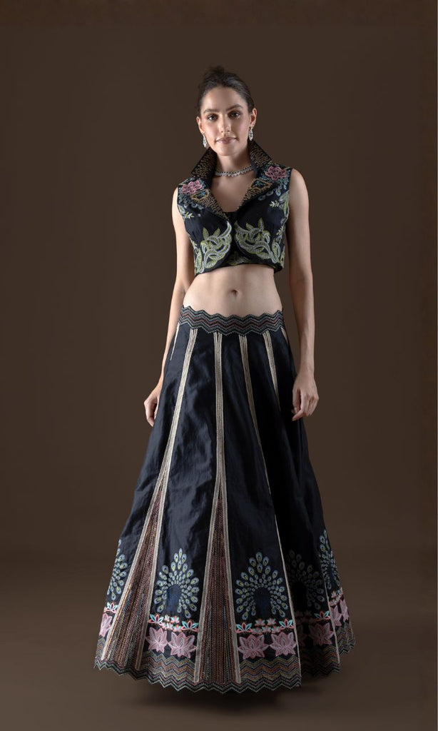 Redefine ethnic fashion with the Midnight Noir Set. This striking ensemble features a contemporary, sleeveless waistcoat-style blouse with a sharp collar and lapels, heavily embroidered with vibrant peacock and floral motifs in neon green and pink. It is paired with a structured black lehenga skirt designed with vertical gold paneling that elongates the frame. The skirt flourishes at the hem with matching intricate embroidery and a geometric chevron border, creating a look that is bold, modern, and unforgettable.