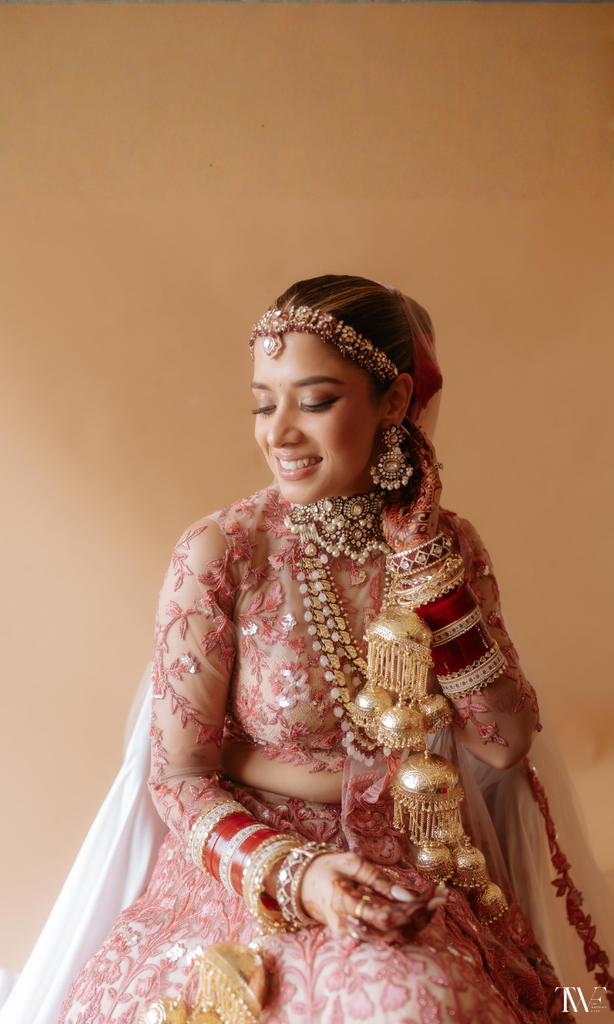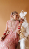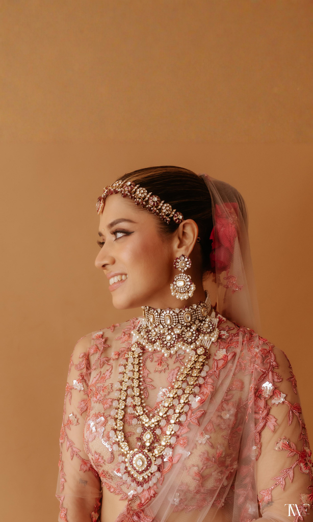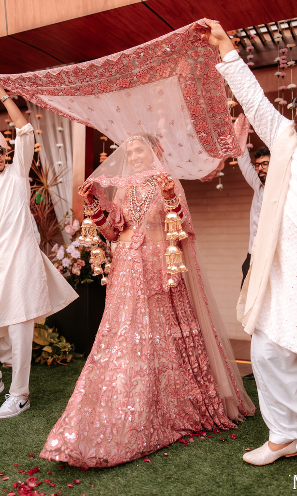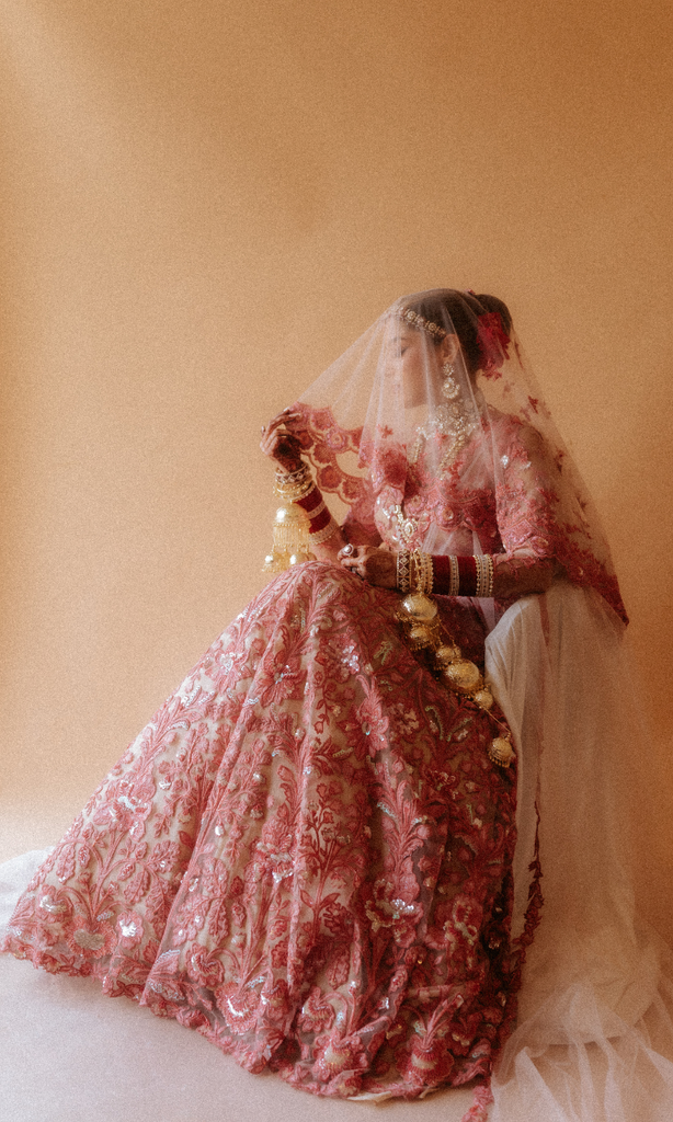 This exquisitely hand-embroidered lehenga blooms in shades of rose and ruby, woven with intricate threadwork and shimmering sequins that catch the light with every gentle movement. The delicate veil—adorned with soft floral motifs—drapes like poetry, adding a dreamlike softness to the ensemble.