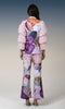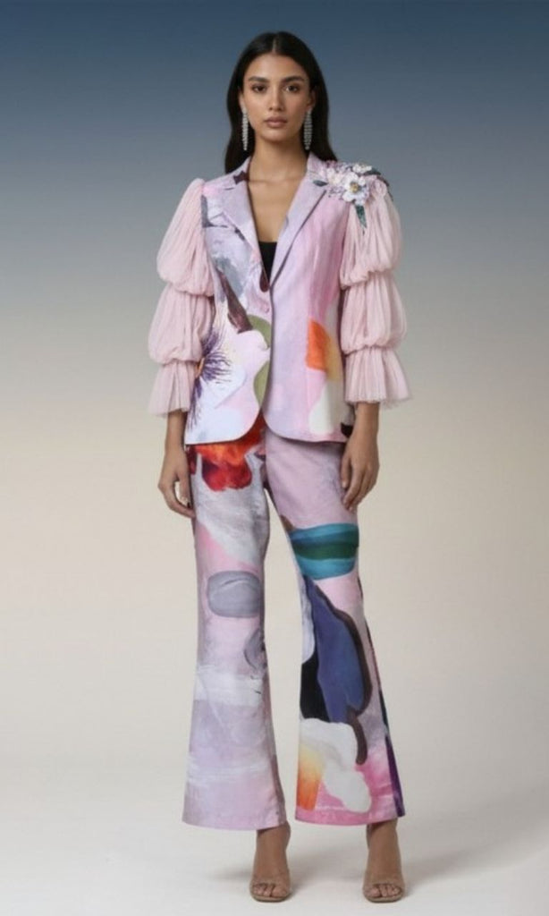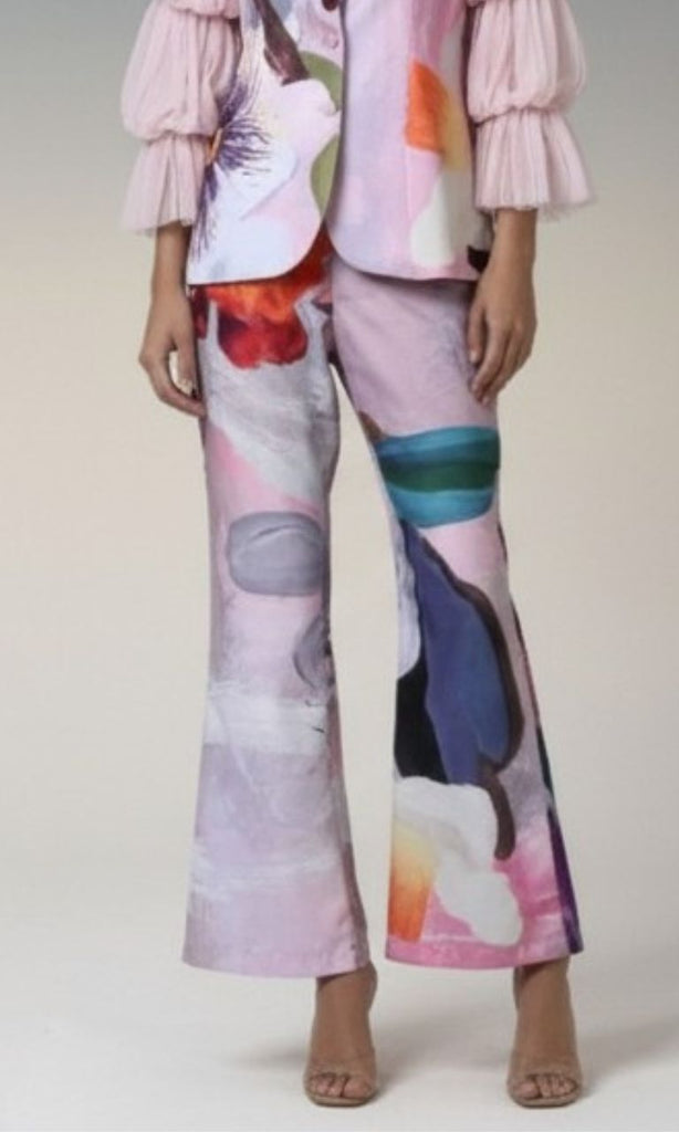 These vibrant statement pants feature a bold, multi-colored abstract print that mirrors the artistic flair of the matching collection. Designed with a contemporary flared silhouette, they offer a flattering fit that widens elegantly toward the hem. The design showcases a rich palette of deep purple, teal, and warm orange splashes set against a soft lilac and pink watercolor background. Crafted for a coordinated look, these trousers pair perfectly with the matching ruffled-sleeve top for a high-fashion, artistic ensemble.