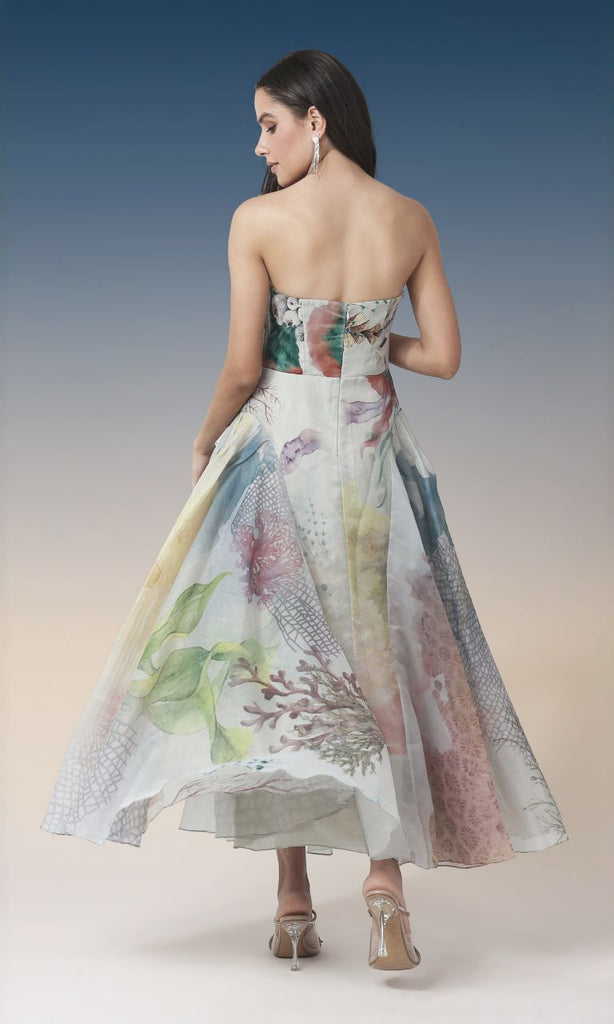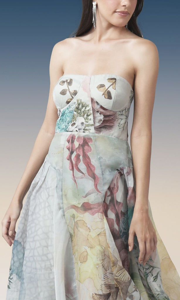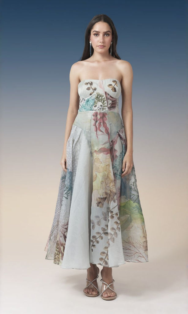 A graceful strapless midi dress featuring a soft pastel botanical print inspired by ocean florals and coral textures. Designed with a structured bodice and a gently flared skirt, this dress creates a flattering, feminine silhouette with beautiful movement. Light, airy, and artistic, it’s perfect for garden parties, resort wear, daytime celebrations, or elegant summer occasions.