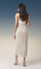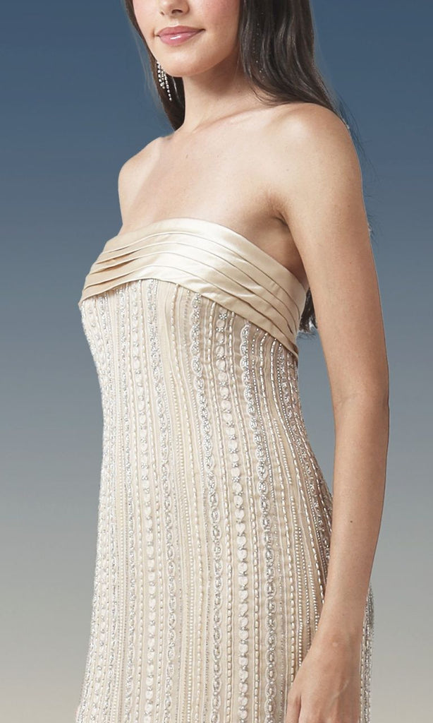 This elegant champagne-toned midi dress features a sleek strapless neckline with layered pleated detailing, adding a touch of refined structure. The body is adorned with intricate vertical embellishments that create a slimming, elongated silhouette. Sophisticated and timeless, this dress is perfect for evening events, cocktail parties, and special celebrations where understated glamour stands out.