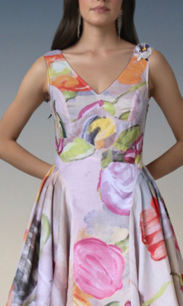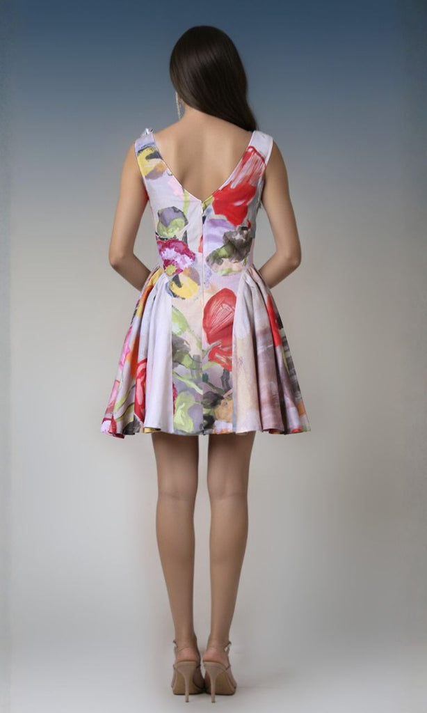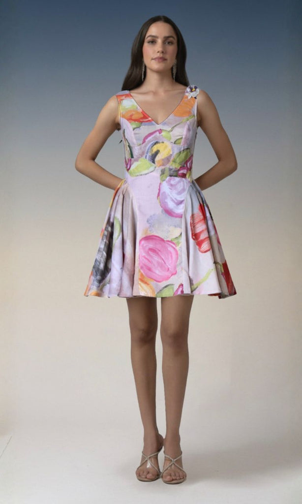 A playful yet polished dress designed to make every moment feel special. This sleeveless mini features a flattering V-neckline and a softly structured bodice that flows into a gentle flared skirt, creating a beautifully balanced silhouette. Rendered in a vibrant floral print with painterly details, it brings together femininity and ease in equal measure. Light, graceful, and effortlessly chic—perfect for daytime occasions, brunches, or sunlit celebrations.