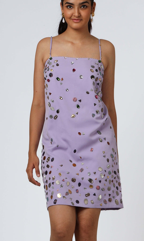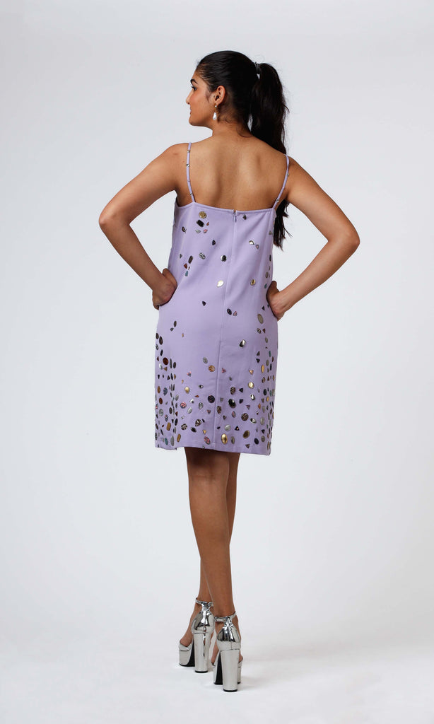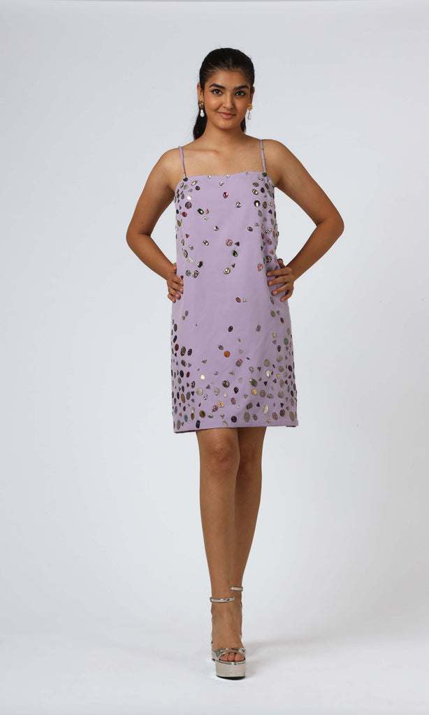 Step into a summer soirée with our delightful Fallon mini dress dotted with playful mirrored embellishments that shimmer with every step. Picture yourself under the warm glow of evening lights, as you mingle through the crowd. With its delicate straps and straight silhouette, this dress is perfect for cocktail nights or a stylish date.