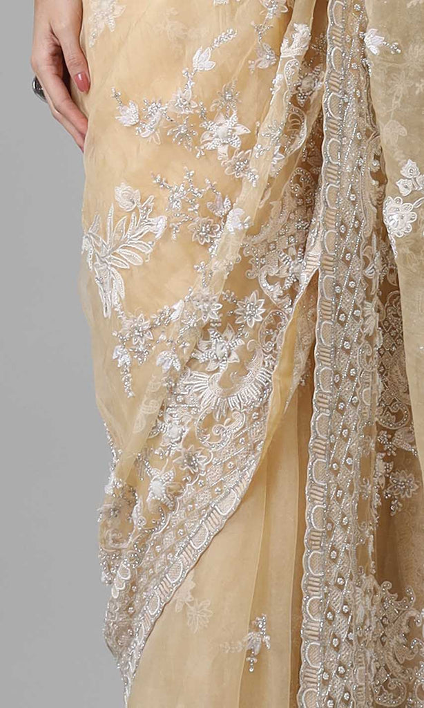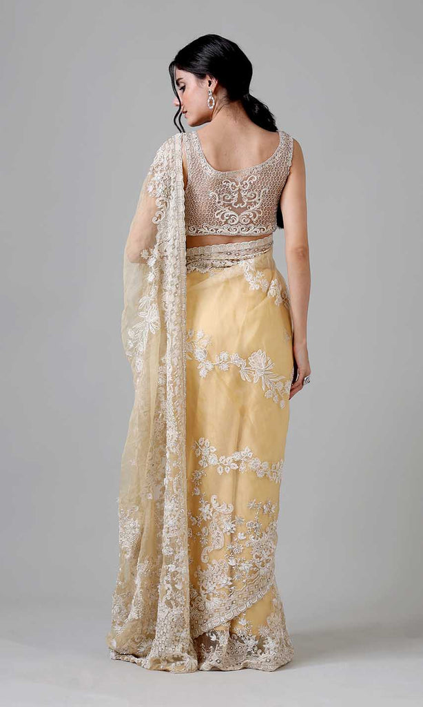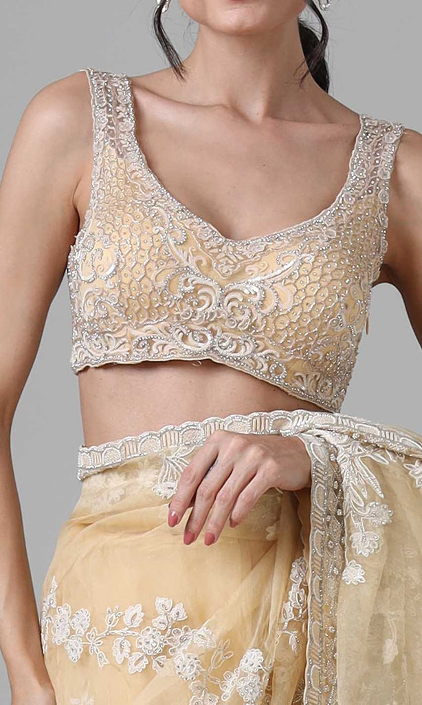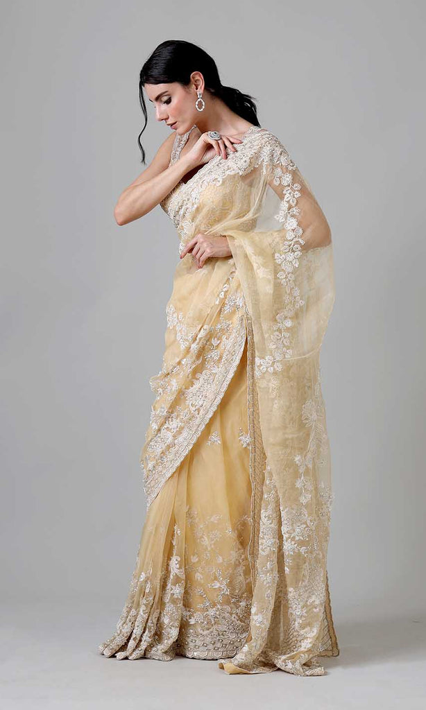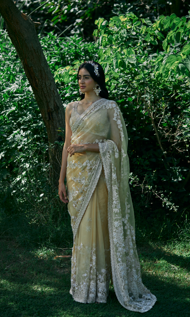 Is there anything more romantic than a saree? Our 'Sylvie' saree is such a romantic number, beautifully handcrafted and intricately embroidered, and comes with an equally romantic blouse. Trust us when we say that you'll look for excuses to wear this one. Keep the jewelry minimal and let the saree do the talking for you.