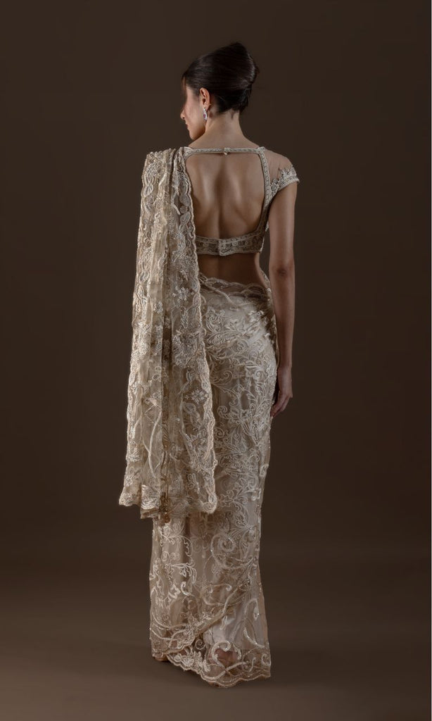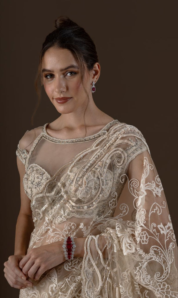 The Ivory Allure Sculpted Saree is draped in romance, featuring a translucent off-white base heavily adorned with exquisite floral vine embroidery. Paired with a stunningly fitted blouse featuring a sheer yoke and sculpted bustier detail, this outfit balances sophistication with a hint of allure, making it an unforgettable choice for evening soirees.