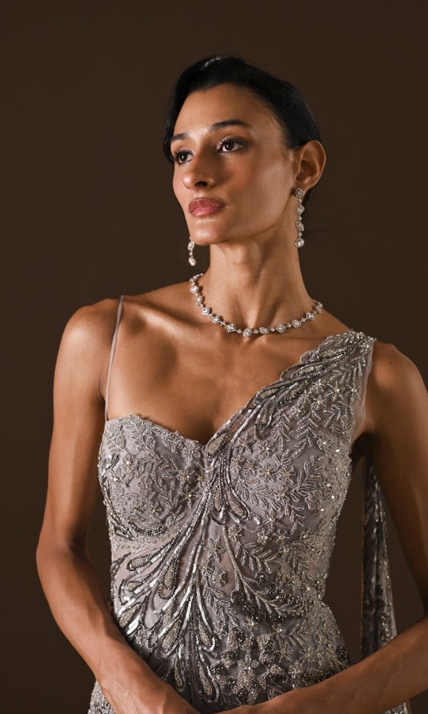 Home / Collections / The Gilded Mirage / Silver Elegance Gown