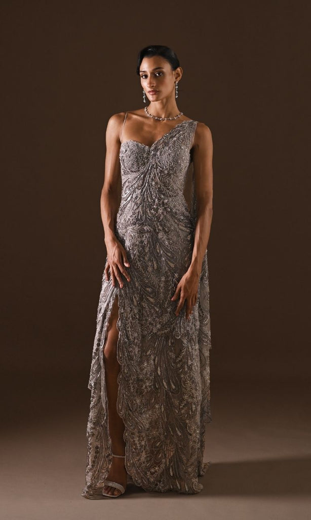 This stunning one-shoulder gown features intricate silver beadwork and sequin embroidery that flows gracefully across the silhouette. Crafted to flatter the figure, it showcases a subtle shimmer, a sleek fitted bodice, and a thigh-high slit for a touch of modern allure. Perfect for evening galas, cocktail receptions, and formal celebrations, this gown radiates timeless glamour with a contemporary edge.