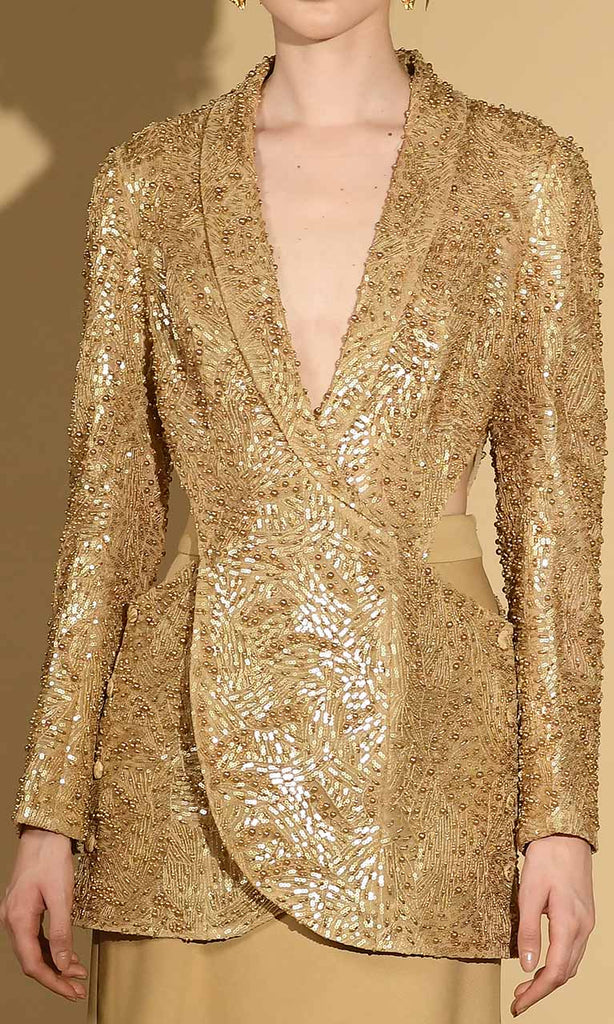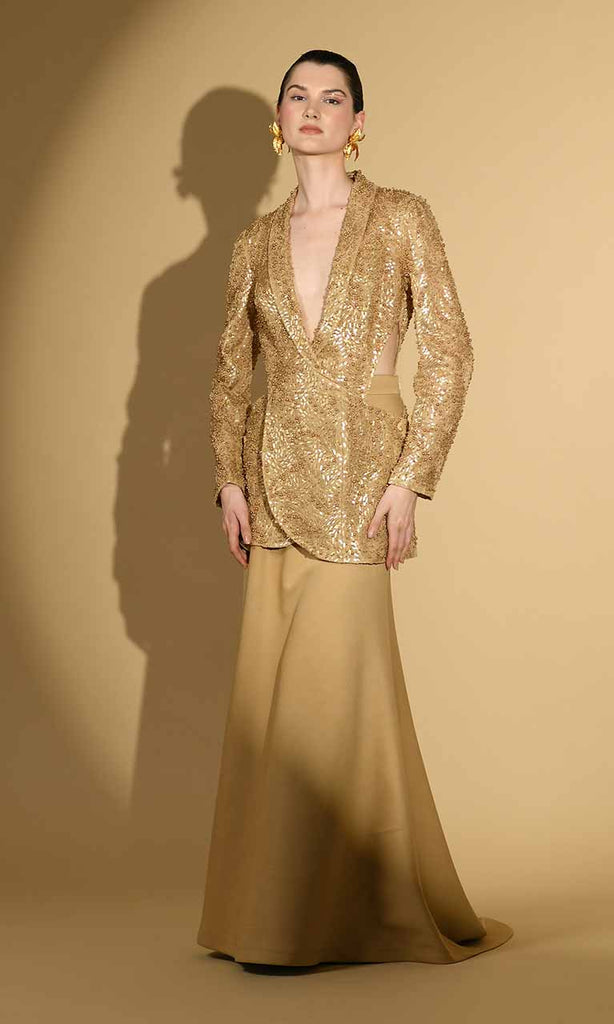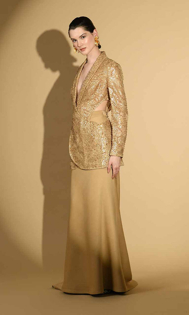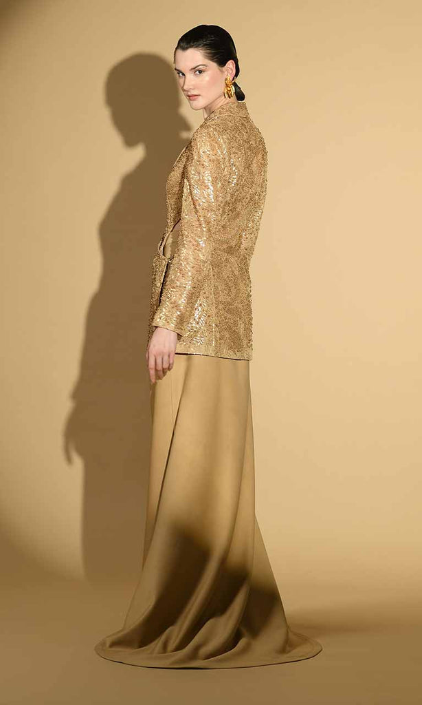 The Aria set features a gold embroidered jacket with side cut-outs and an A-line skirt with a little trail at the back. This look is no doubt a statement after-party look, accessorize it with OTT jewelry and complete the look with an evening clutch.