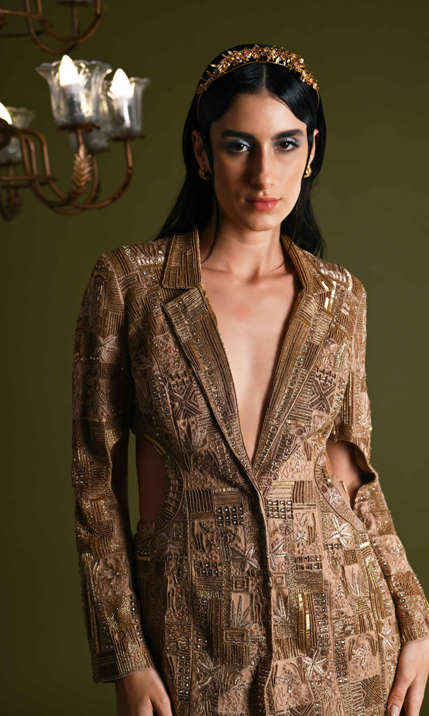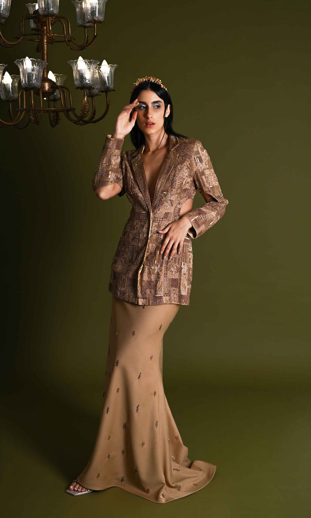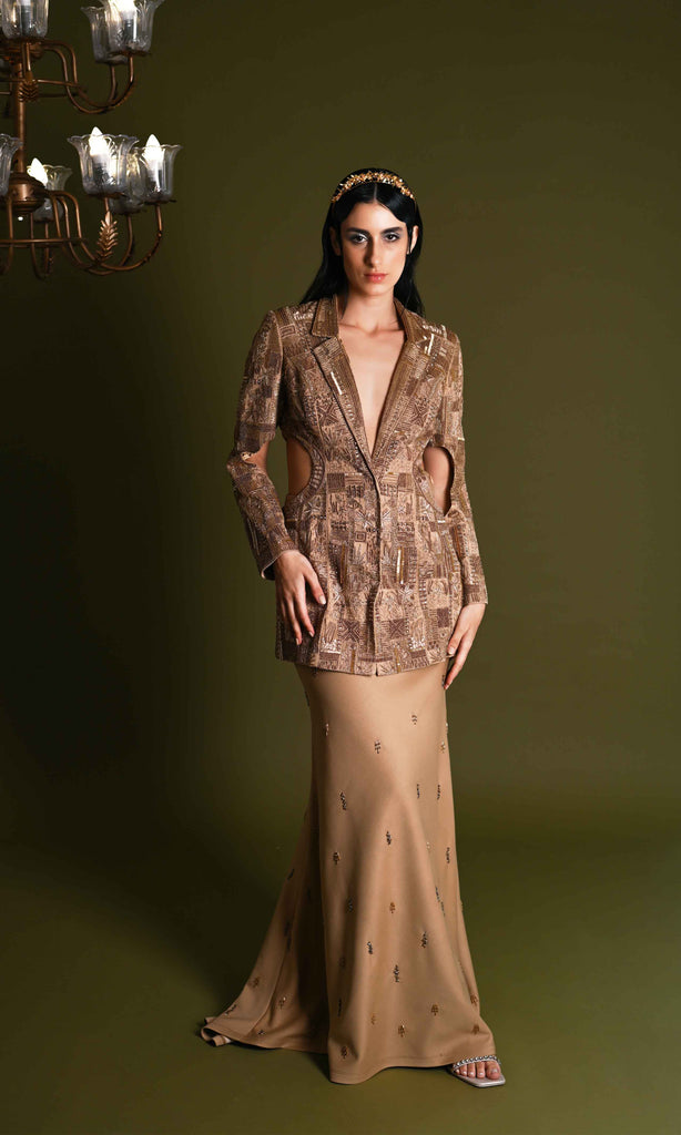 "Elevate Your Style with Fariya Blazer Skirt Set - Where Abstract Gold Meets Modern Glamour." It's a celebration of artistry and elegance, featuring overall abstract gold embroideries that create a mesmerizing allure. The cutout detail at the waist and sleeves adds a touch of modernity. Pair the blazer with our fine fish-cut skirt in a stunning golden hue, adorned with delicate buta embroideries that gracefully grace the canvas. Keep your accessories minimal to let the ensemble shine. A pair of statement earrings and a clutch in a complementary color will do the trick.